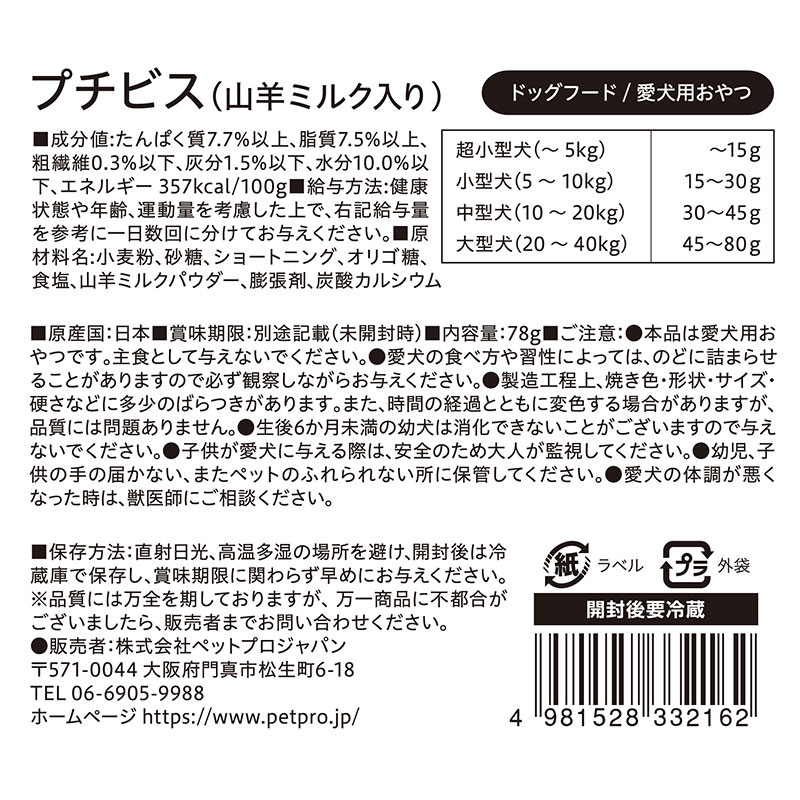 ・本品は愛犬用おやつです。主食として与えないでください。 ・愛犬の食べ方や習性によっては、のどに詰まらせることがありますので必ず観察しながらお与えください。 ・製造工程上、焼き色・形状・サイズ・硬さなどに多少のばらつきがあります。 ・時間の経過とともに変色する場合がありますが、品質には問題ありません。 ・生後6ヶ月未満の幼犬は消化できないことがございますので与えないでください。 ・子供が愛犬に与える際は、安全のため大人が監視してください。 ・幼児、子供の手の届かない、またペットのふれられない所に保管してください。 ・愛犬の体調が悪くなった時は、獣医師にご相談ください。 |