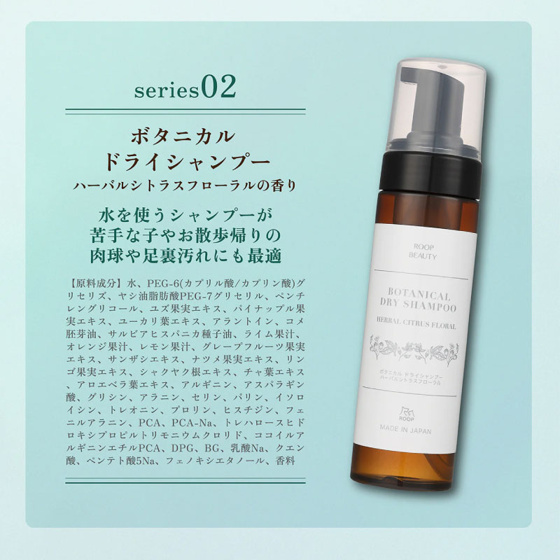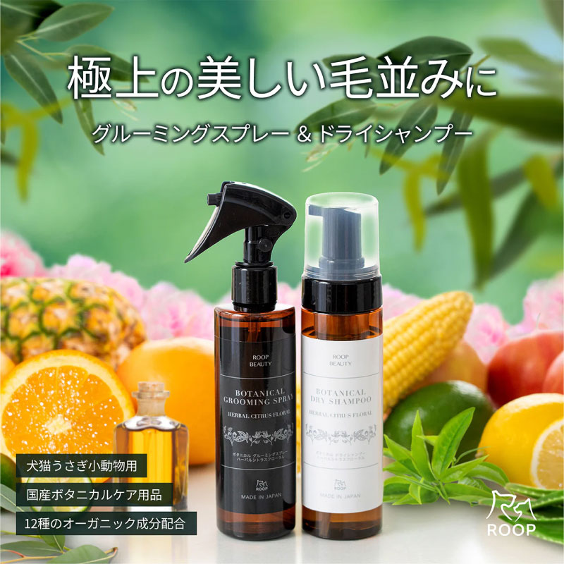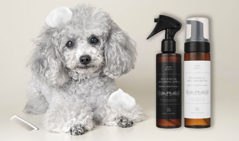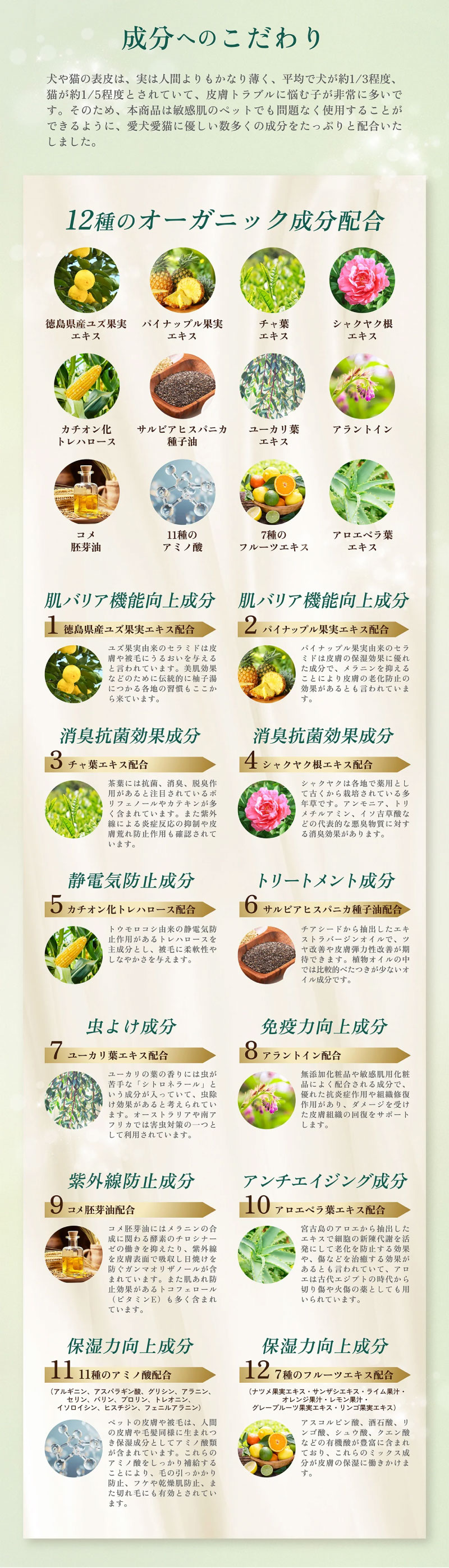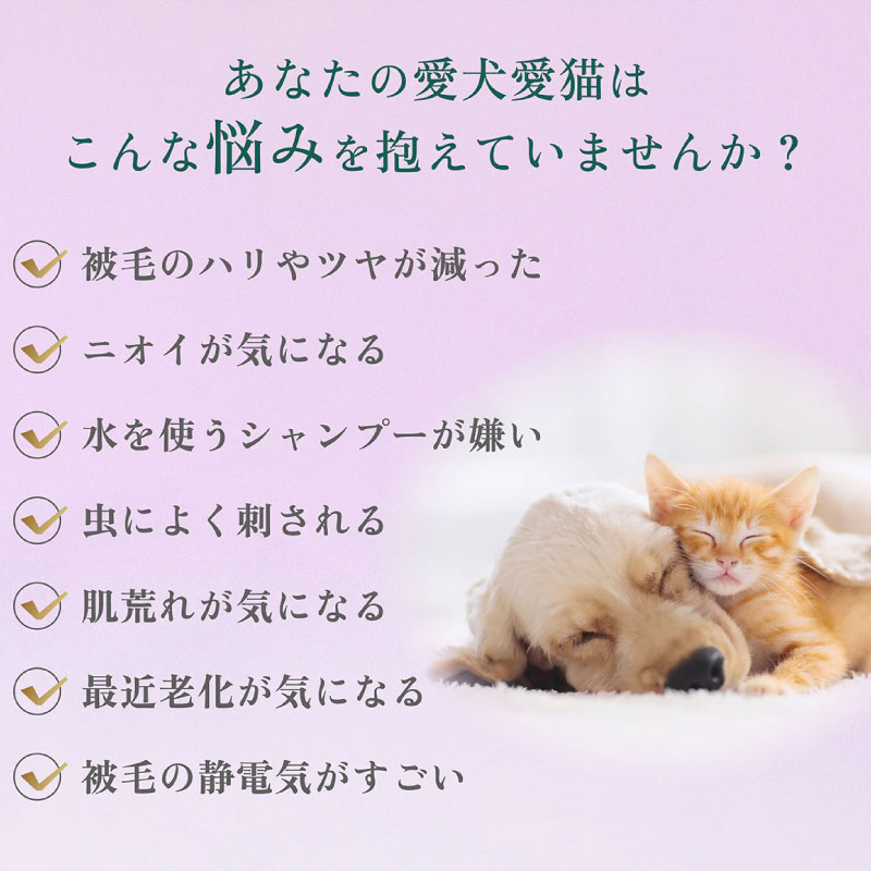 敏感肌のペットでも使える12種類のオーガニック成分(トリートメント成分、セラミド成分、静電気防止成分、抗菌消臭成分、虫よけ成分など)をたっぷり配合した、水で洗い流す必要がないドライシャンプーです。