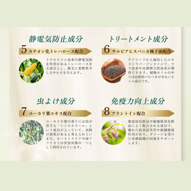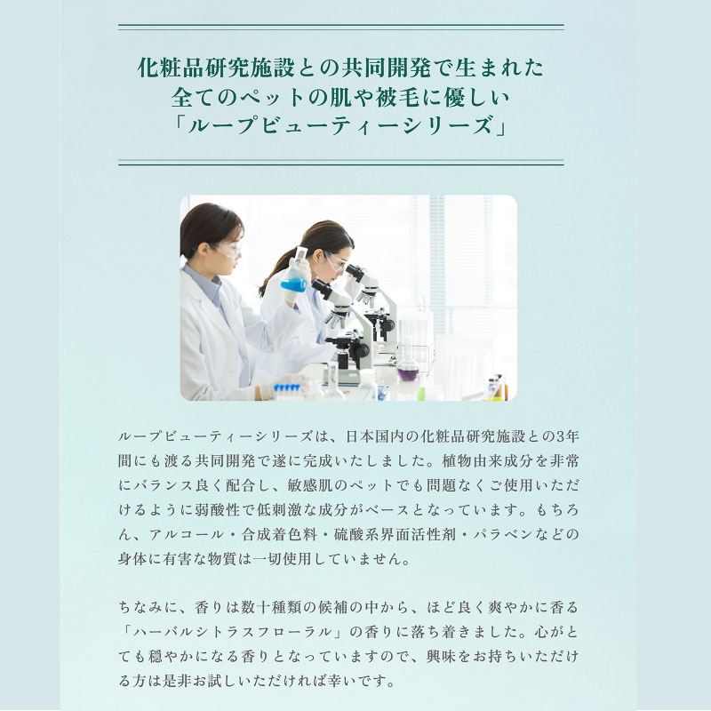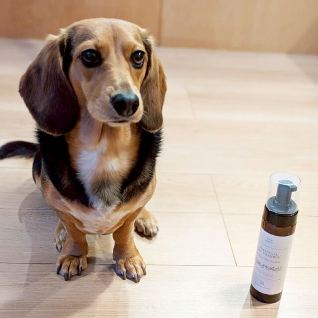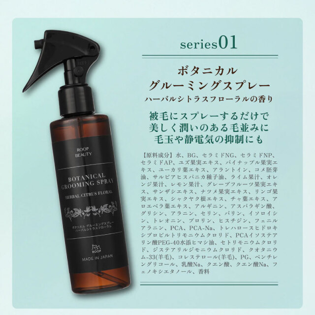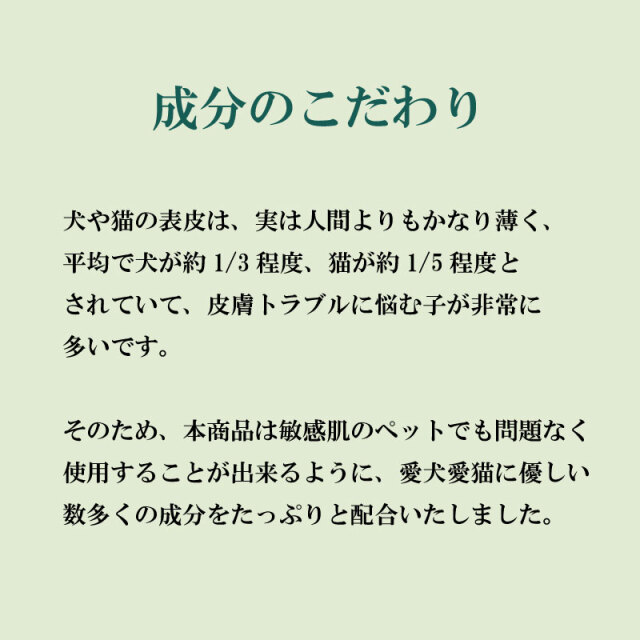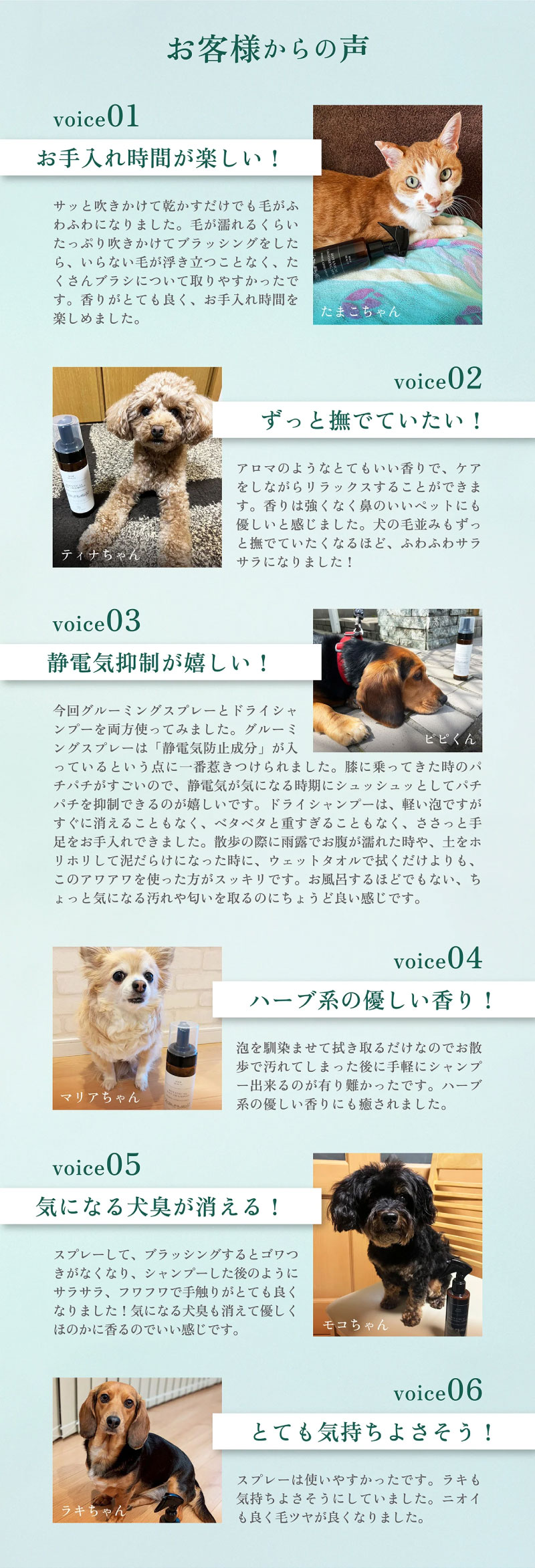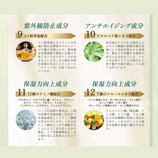 敏感肌のペットでも使える12種類のオーガニック成分(トリートメント成分、セラミド成分、静電気防止成分、抗菌消臭成分、虫よけ成分など)をたっぷり配合した、水で洗い流す必要がないドライシャンプーです。