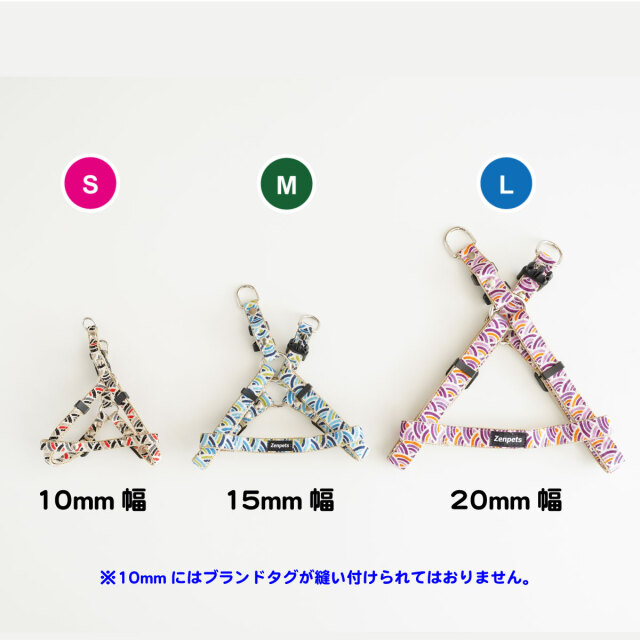 S…幅:10mm 胴まわり:約27~37cm 適応体重:~約8kg M…幅:15mm 胴まわり:約32~52cm 適応体重:約8kg L…幅:20mm 胴まわり:約44~70cm 適応体重:約15kg |