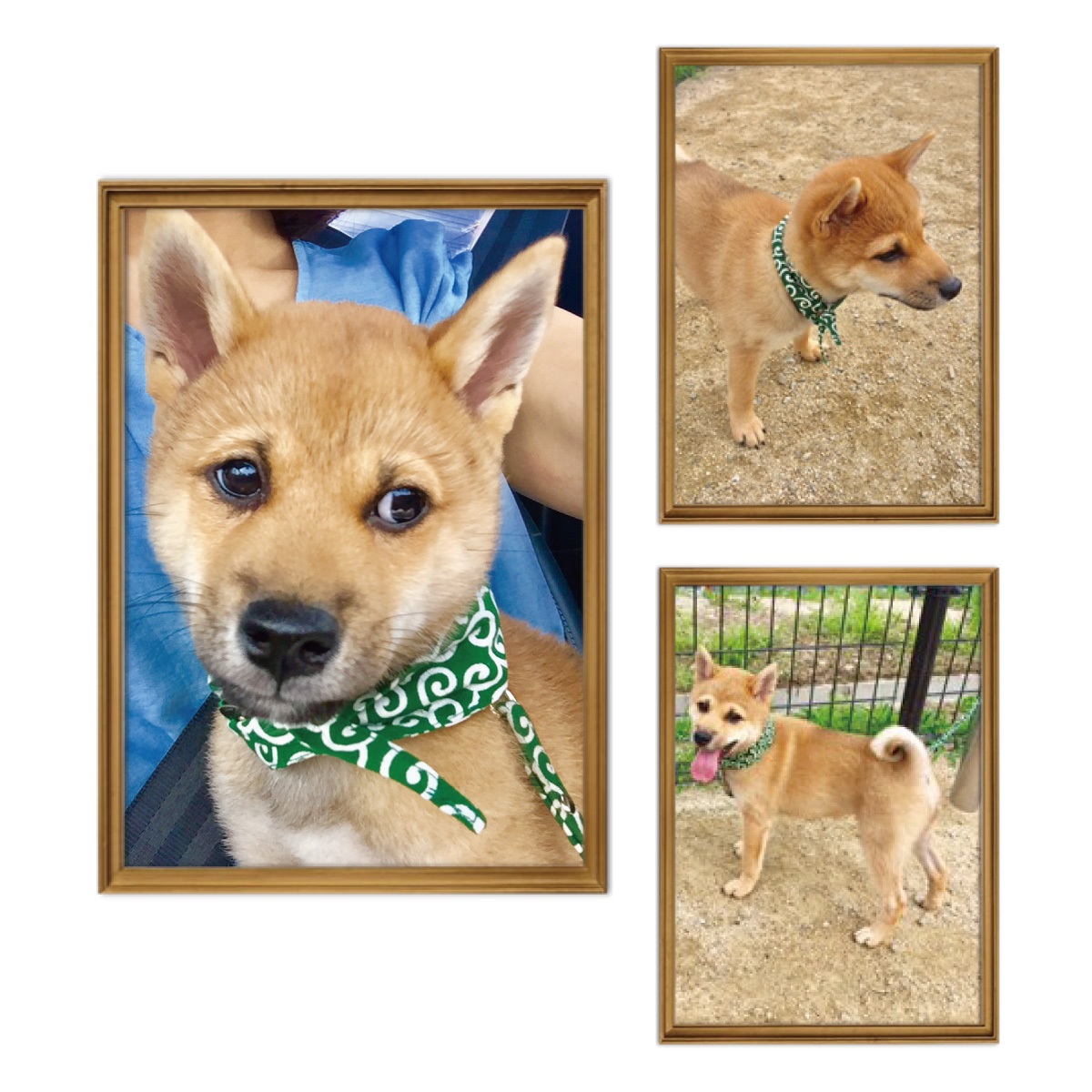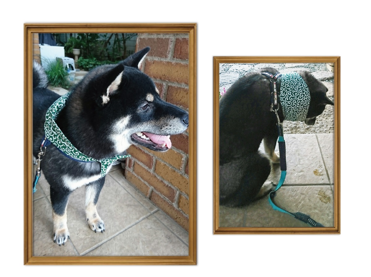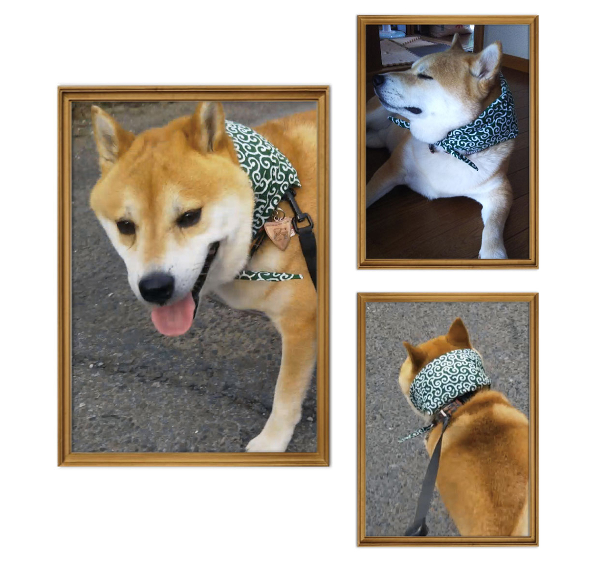 | 当店スタッフから: 新たな装備、唐草バンダナも身に纏ったのはポン助くん(3ヶ月)。 先月頂いた写真と見比べると、身体が大きくなっただけでなく顔つきも凛々しくなってきましたね。 首輪やリードも唐草の緑色で揃えて頂いているので統一感があり、格好よく映りますね。 今後とも末永くお使い頂けましたら幸いではございます。 |