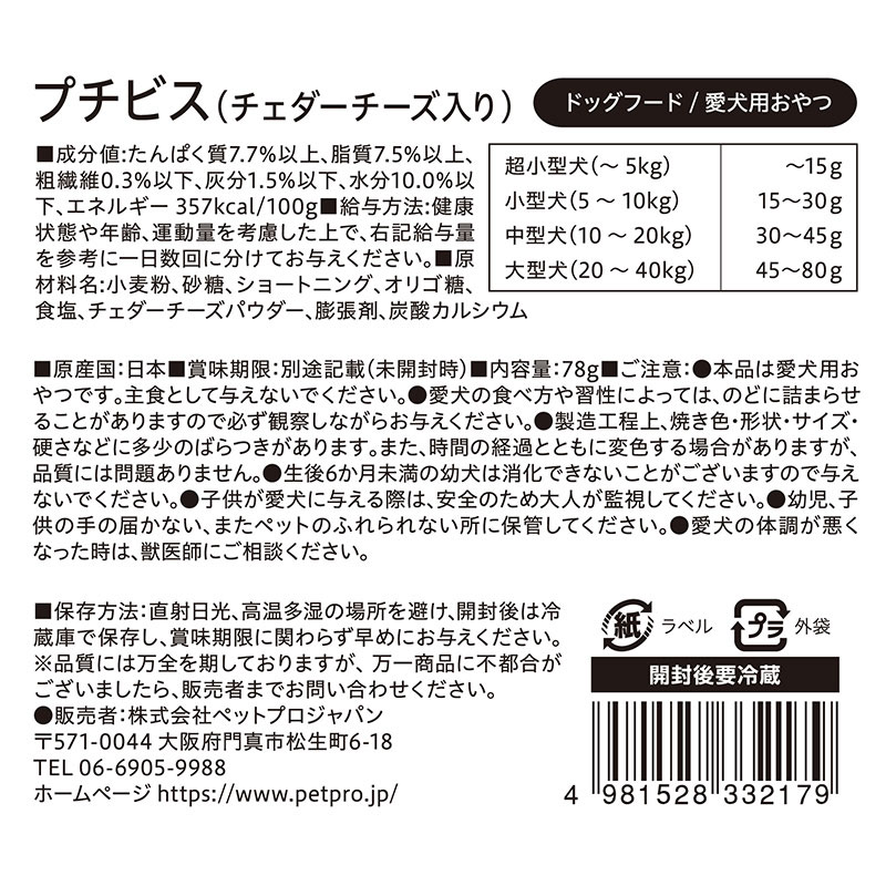・本品は愛犬用おやつです。主食として与えないでください。 ・愛犬の食べ方や習性によっては、のどに詰まらせることがありますので必ず観察しながらお与えください。 ・製造工程上、焼き色・形状・サイズ・硬さなどに多少のばらつきがあります。 ・時間の経過とともに変色する場合がありますが、品質には問題ありません。 ・生後6ヶ月未満の幼犬は消化できないことがございますので与えないでください。 ・子供が愛犬に与える際は、安全のため大人が監視してください。 ・幼児、子供の手の届かない、またペットのふれられない所に保管してください。 ・愛犬の体調が悪くなった時は、獣医師にご相談ください。 |