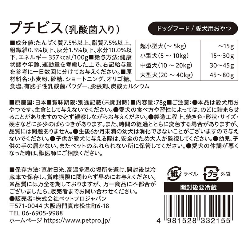 ・本品は愛犬用おやつです。主食として与えないでください。 ・愛犬の食べ方や習性によっては、のどに詰まらせることがありますので必ず観察しながらお与えください。 ・製造工程上、焼き色・形状・サイズ・硬さなどに多少のばらつきがあります。 ・時間の経過とともに変色する場合がありますが、品質には問題ありません。 ・生後6ヶ月未満の幼犬は消化できないことがございますので与えないでください。 ・子供が愛犬に与える際は、安全のため大人が監視してください。 ・幼児、子供の手の届かない、またペットのふれられない所に保管してください。 ・愛犬の体調が悪くなった時は、獣医師にご相談ください。 |